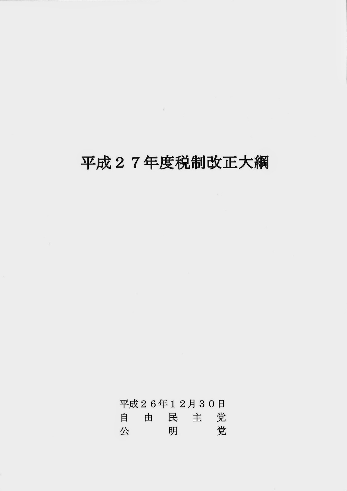 自民党税制調査会(会長・野田毅衆院議員)は平成26年12月30日(火)の総会で平成27年度税制改正大綱をまとめ、、自由民主党と公明党が「平成27年度税制改正大綱」を公表しました。
